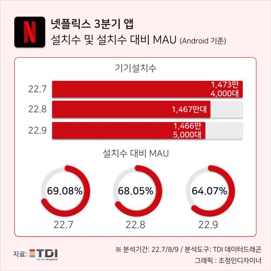 3분기 넷플릭스 앱 설치수와 설치수 대비 MAU(월 사용자 수)를 빅데이터 전문기업 TDI(티디아이, 대표 이승주)의 분석 플랫폼 데이터드래곤을 통해 분석해봤다.