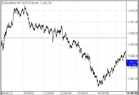 이날 환율은 전일 대비 1.2원 하락한 1327.0원에 시작한 뒤 중국 위안화 약세 등에 연동해 장중 1333.8원까지 오르면서 상승 전환했으나 오후로 갈수록 달러화 약세 전환, 네고 등 달러 매도 우위 등에 하락 흐름을 굳히며 1320원대로 떨어졌다.