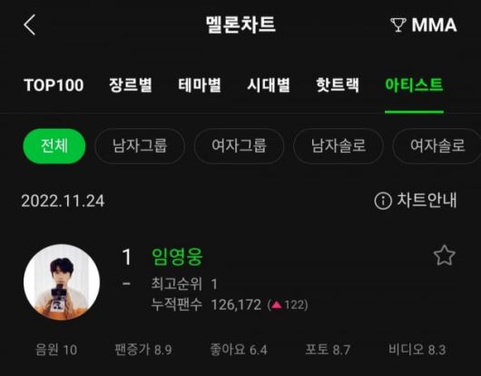 지난 24일 멜론에 따르면 임영웅은 아티스트 차트에서 전체 1위를 차지했다.