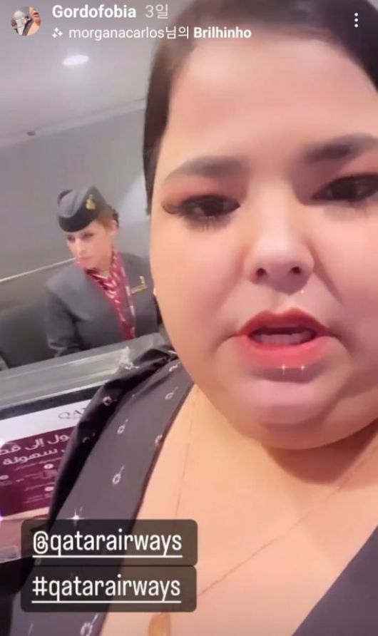 브라질의 인플루언서이자 빅 사이즈 모델인 줄리아나 네메가 카타르항공 카운터 앞에서 탑승 거부 상황에 대해 말하고 있다. 사진=네메 인스타그램 캡처 |