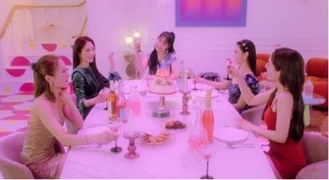 영상을 보면 화려한 드레스를 입은 멤버들이 파티장의 식탁에 둘러앉아 밝은 미소로 다 같이 축배를 들고 있다.