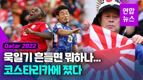 27일(현지시간) 일본과 코스타리카의 월드컵 조별리그 E조 2차전 경기가 열리는 카타르 알라이얀의 아흐마드 빈 알리 스타디움 관중석에선 욱일기가 펼쳐졌습니다.