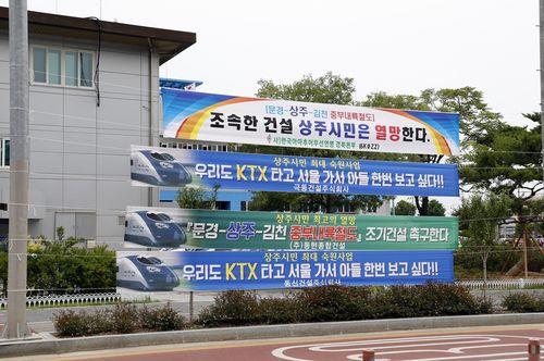 상주시 도심에 걸린 중부내륙철도 조기건설 촉구 현수막 |