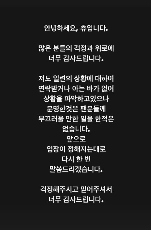 28일 오후 츄는 "안녕하세요, 츄입니다"라고 시작되는 글을 게재했다.