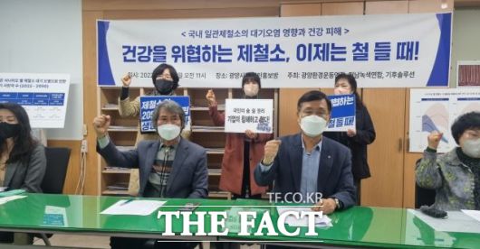 전남녹색연합과 광양환경운동연합, 기후솔루션 등 환경운동단체 관계자들이 "건강을 위협하는 제철소 이제는 철 들 때"라는 구호를 외치고 있다. /유홍철 기자 |