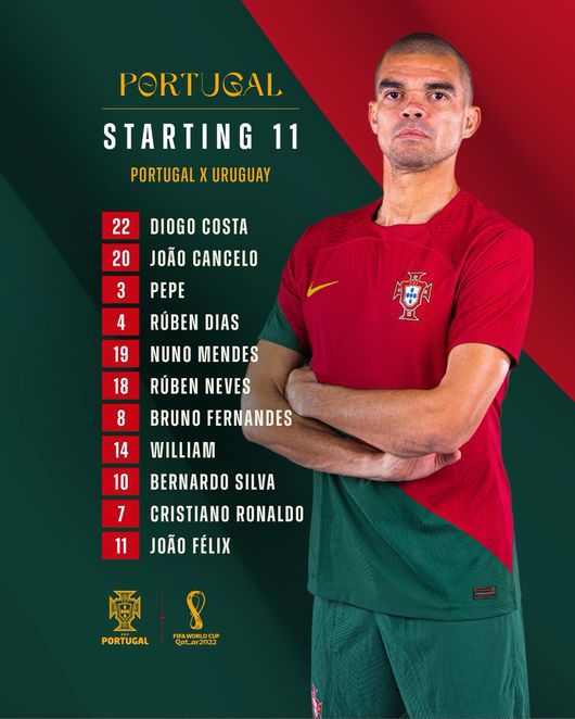 경기를 앞두고 양 팀의 선발 명단이 발표됐다. 이 경기 승리 시 16강 진출이 확정되는 포르투갈은 4-3-3 포메이션을 꺼내 든다. 주앙 펠릭스, 크리스티아누 호날두, 베르나르두 실바, 윌리엄 카르발류, 후벵 네베스, 브루노 페르난데스, 누노 멘데스, 페페, 후벵 디아스, 주앙 칸셀루, 디오고 코스타 골키퍼가 선발로 나선다.