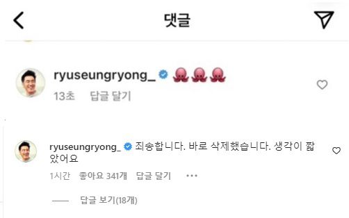 이런 와중에 류승룡도 해당 SNS에 문어 이모티콘을 댓글로 남기며 주목을 받았다. 해당 소식이 커뮤니티를 통해 빠르게 퍼치자 류승룡은 "죄송합니다. 바로 삭제했습니다. 생각이 짧았어요"라고 해명했다.