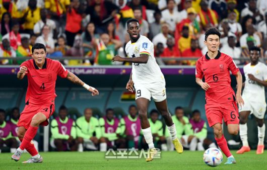 김민재(왼쪽)와 황인범이 28일 카타르 도하 에듀케이션 시티 스타디움에서 열린 2022 카타르 월드컵 조별리그 H조 2차전 가나와 경기에서 상대를 놓치고 있다. 2022. 11. 28.도하(카타르) | 최승섭기자 thunder@sportsseoul.com |