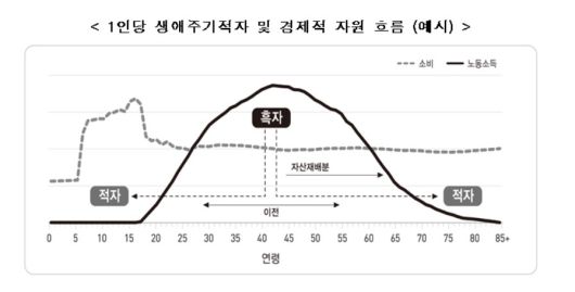 국민이전계정은 소비와 노동소득의 관계를 연령 변화에 초점을 두고 연령집단(세대) 간 경제적 자원의 흐름을 파악하는 통계다. 인구구조 변화에 따른 정부·가계의 재정 부담 등 미래 위험요인을 선제적으로 대비하고자 작성된다.