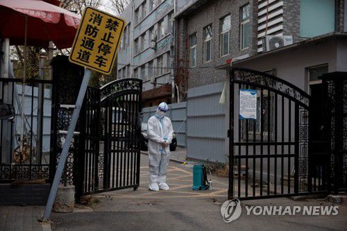 봉쇄된 베이징 주택지구 앞 지키는 방역요원 |