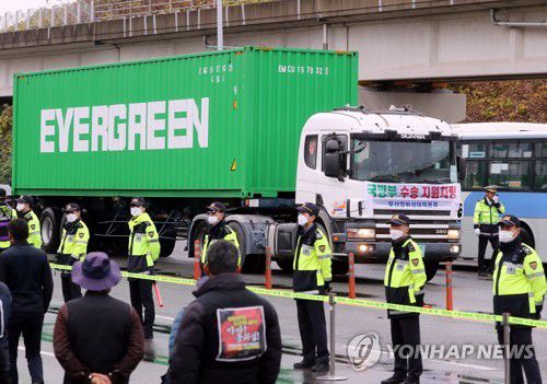 (부산=연합뉴스) 강덕철 기자 = 화물연대 파업 엿새째인 29일 국방부 수송지원 차량이 집회가 열리고 있는 부산 강서구 부산신항 삼거리 인근 도로를 지나가고 있다. 2022.11.29 kangdcc@yna.co.kr ▶제보는 카카오톡 okjebo▶연합뉴스 앱 지금 바로 다운받기~▶네이버 연합뉴스 채널 구독하기 <저작권자(c)연합뉴스. 무단전재-재배포금지.>