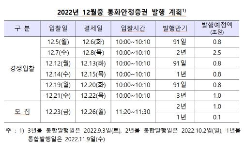 7조8000억원 중 경쟁입찰로 6조7000억원을, 모집을 통해 1조1000억원을 발행한다. 경쟁입찰일은 다음달 5일, 7일, 12일, 14일, 19일, 21일이다. 모집을 통한 발행 입찰일은 12월 23일로 만기 2년짜리 1조원과 1년짜리 1000억원 각각 발행할 예정이다.