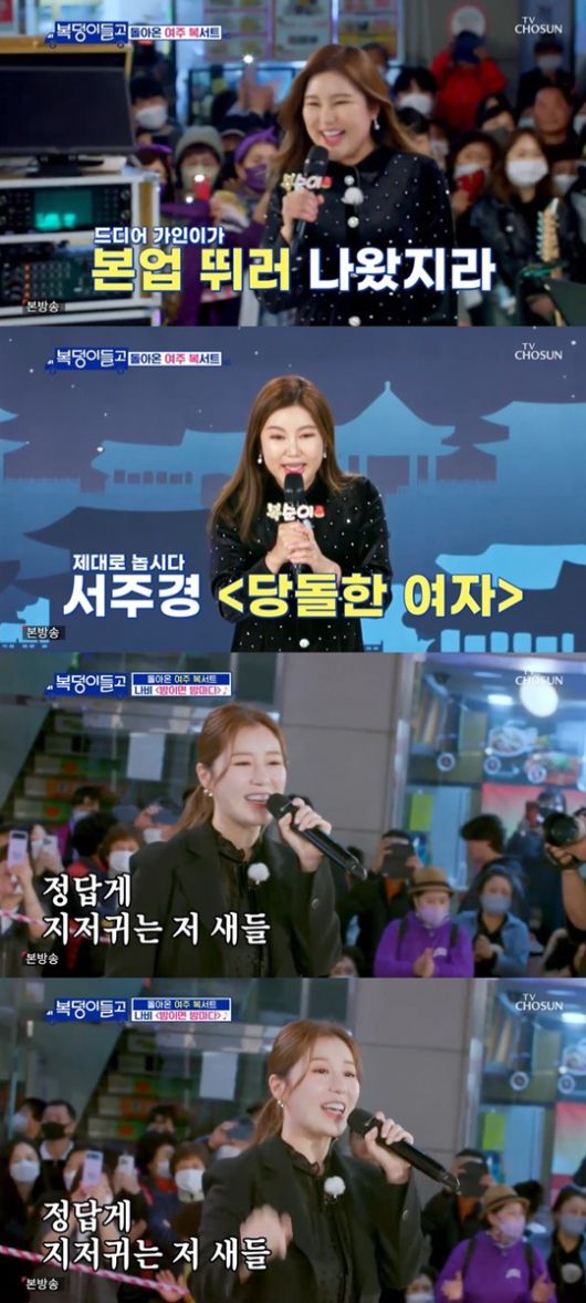 송가인은 서주경의 '당돌한 여자'를 부르며 구성진 가락을 뽑아냈다. 송가인은 몸에 밴 듯한 무대 매너로 객석을 홀렸다.