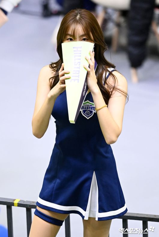 (엑스포츠뉴스 수원, 김한준 기자) 30일 오후 수원실내체육관에서 열린 '도드람 2022-23시즌 V-리그' 현대건설과 KGC인삼공사의 경기, 치어리더 안지현이 열띤 응원을 펼치고 있다,