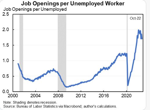 이는 감소하고는 있지만 인플레이션 압력을 유지하게 합니다. 제이슨 퍼먼 하버드대 경제학과 교수는 “10월에 일자리와 퇴사가 감소하면서 전반적으로 실업자 1명당 1.7개의 일자리가 있고 이는 피크였던 3월의 2.0개에서 감소한 것이다. 이러한 패턴은 인플레이션이 완화하는 데 도움이 된다”면서도 “하지만 지금의 노동시장이 2%(연준의 목표) 혹은 3%의 인플레이션과 어떻게 조화를 이룰지 모르겠다”고 우려했는데요.