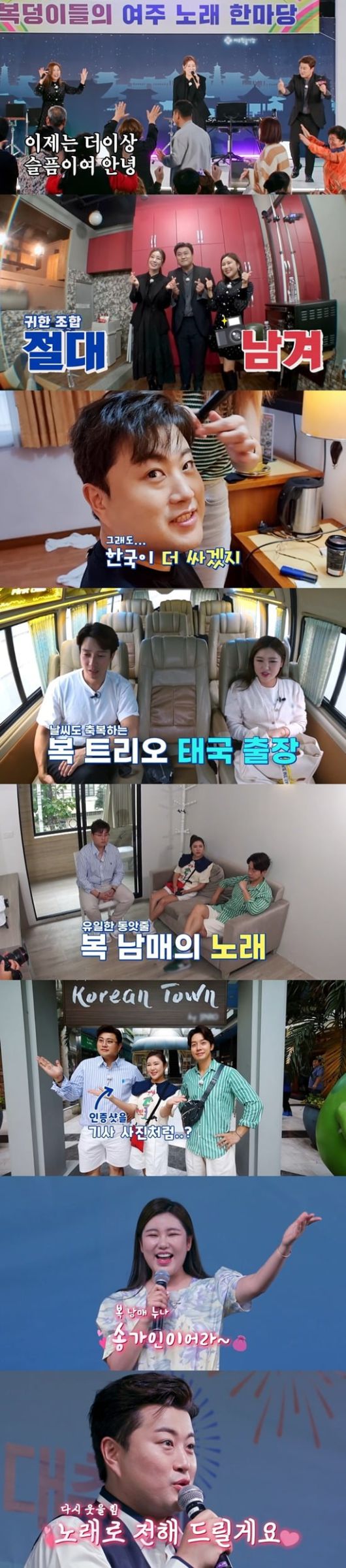 여주의 열기가 식기도 전, 해외 애청자들의 성원과 수많은 사연에 힘입어 하늘길까지 건너간 복남매표 글로벌 역조공이 성사됐다. 이들의 첫 행선지는 바로 역사와 현재가 공존하는 나라 태국이었다. 송가인의 공연 스케줄로 하루 먼저 방콕행 비행기에 오른 김호중은 고소공포증을 호소하며 시름시름 앓다가도 기내식으로 나온 불고기 쌈밥을 폭풍 흡입한 뒤 행복한 단잠을 청해 시청자들의 웃음을 자아냈다.
