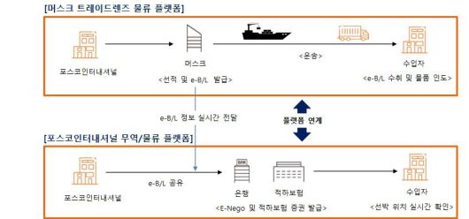 포스코인터내셔널의 무역 물류 플랫폼과 모스크사의 트레이드렌즈 물류 플랫폼을 연계한 수출입 서류 흐름도. /포스코인터내셔널 |