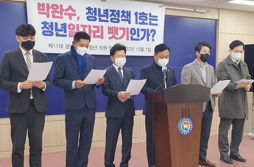(창원=연합뉴스) 황봉규 기자 = 더불어민주당 전·현직 경남도의원들은 1일 경남도청 프레스센터에서 기자회견을 열고 경남청년센터 폐지 결정을 철회하라고 촉구했다.