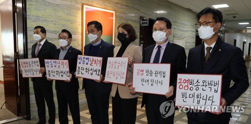 (서울=연합뉴스) 하사헌 기자 = 언론인 출신 국민의힘 의원들과 국민의힘 소속 과방위원들이 2일 서울 여의도 국회 과학기술정보방송통신위원회 회의실 앞에서 과방위 전체회의가 열리기에 앞서 방송법 개정안 반대 피켓시위를 하고 있다. 2022.12.2