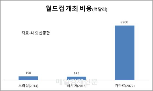 카타르가 이번 월드컵에 지출하는 총 금액은 2200억 달러(300조원)에 달할 것으로 추산된다. 2014년 브라질 월드컵 개최비용이 150억 달러(20조2500억 원), 2018년 러시아 월드컵 개최비용이 142억 달러(19조1700억 원)로 계산됐다는 점을 고려하면 카타르 월드컵은 이들 나라보다 10배가 훨씬 넘는 돈이 투입된 셈이다. 카타르가 2012년 월드컵 개최지로 확정된 이후 연평균 지출한 월드컵 관련 예산은 매년 183억 달러(24.7조원)씩 지출됐다.