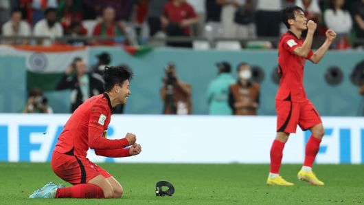 대한민국이 포르투갈에게 2:1로 역전승을 거뒀고 경기 종료 휘슬과 동시에 대한민국 선수단이 경기장으로 뛰쳐나와 기뻐하고 있습니다.