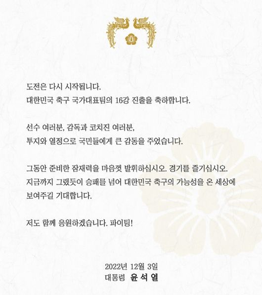 [OSEN=알 라이얀(카타르), 서정환 기자] 한국축구의 극적인 16강 진출 쾌거에 윤석열 대통령도 축전을 보냈다.