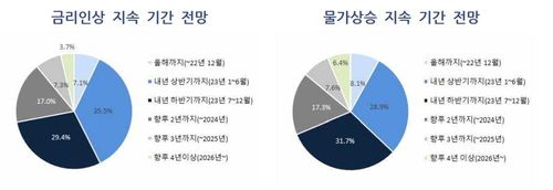 금리 인상은 내년 상반기까지(35.5%) 이어질 것이라는 응답이 가장 많았고, 내년 하반기까지(29.4%)와 2024년까지(17%)가 뒤를 이었다.