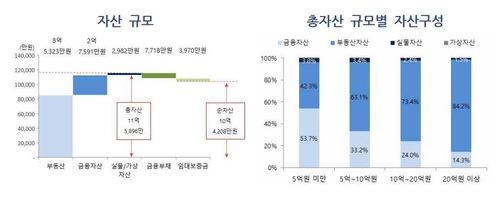 조사 대상자의 평균 총자산은 11억5천896만원으로, 이중 금융자산이 2억7천591만원, 부동산 자산이 8억5천323만원이었다. 부채를 제외한 순자산은 10억4천208만원으로 집계됐다.