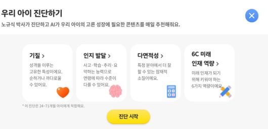 아이들나라 애플리케이션(앱)에 접속하면 넷플릭스나 티빙과 같이 익숙한 OTT 사용자 환경에서 편리하게 메뉴를 선택할 수 있다. 프로필에서 관심사를 설정하고 아이와 부모 성향을 진단할 수 있는 메뉴를 이용해봤다. 이 기능은 아이 성향을 128가지 유형으로 분류할 수 있도록 돕는다. 부모 자신과 아이를 객관적으로 판단하고 앞으로의 육아 및 학습 방향을 설정할 수 있다.
