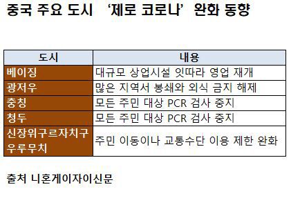 베이징, 광저우, 톈진 등 주요 도시가 제로 코로나 규제를 완화했다. 광저우의 경우 외식 금지 규정이 풀리면서 1일부터 음식점들이 다시 문을 열기 시작했다. 유전자증폭(PCR) 검사 음성 결과지를 내야 건물에 들어갈 수 있었던 규정도 사라져 도시 내 대부분의 검사소도 철거됐다.