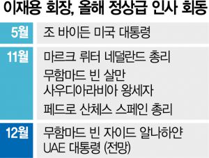 이 회장은 회장 취임 이후 주요국 정상급 인사를 잇따라 만나며 숨 가쁜 일정을 소화하고 있다. 지난달에는 빈 살만 왕세자 외에 마르크 뤼터 네덜란드 총리, 페드로 산체스 스페인 총리 등과 회동했다.