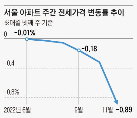 4일 한국부동산원 조사에 따르면, 이번 주 서울 아파트 전세가격은 0.89% 하락했다. 2012년 5월 통계를 집계하기 시작한 후 역대 최대 하락이다. 서울 아파트 전셋값 주간 변동률은 올해 6월까지만 해도 약보합(-0.01%) 수준을 유지했지만, 7월부터 점차 낙폭이 커졌고 10월부턴 0.2% 넘는 하락세가 매주 이어지고 있다. 10월 셋째 주(-0.3%)부터는 7주 연속 역대 최대 하락 기록을 갈아치우고 있다.