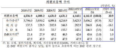한국은행이 5일 발표한 ‘2022년 11월말 외환보유액’ 자료에 따르면 지난달말 외환보유액은 전월 대비 20억9000만달러 증가한 4161억달러로 7월 이후 넉 달만에 처음 증가 전환했다. 외환보유액은 올 3월 이후 4개월째 감소하다가 7월 반등했으나 8월과 9월에 이어 10월까지 석 달 연속 내리 급속도로 줄어들다가 지난달 상승한 것이다. 특히 지난 9월엔 한달만에 196억6000만달러가 줄면서 글로벌 금융위기 때인 2008년 10월(-274억2000만달러) 이후 역대 두 번째 감소폭을 기록하기도 했다.