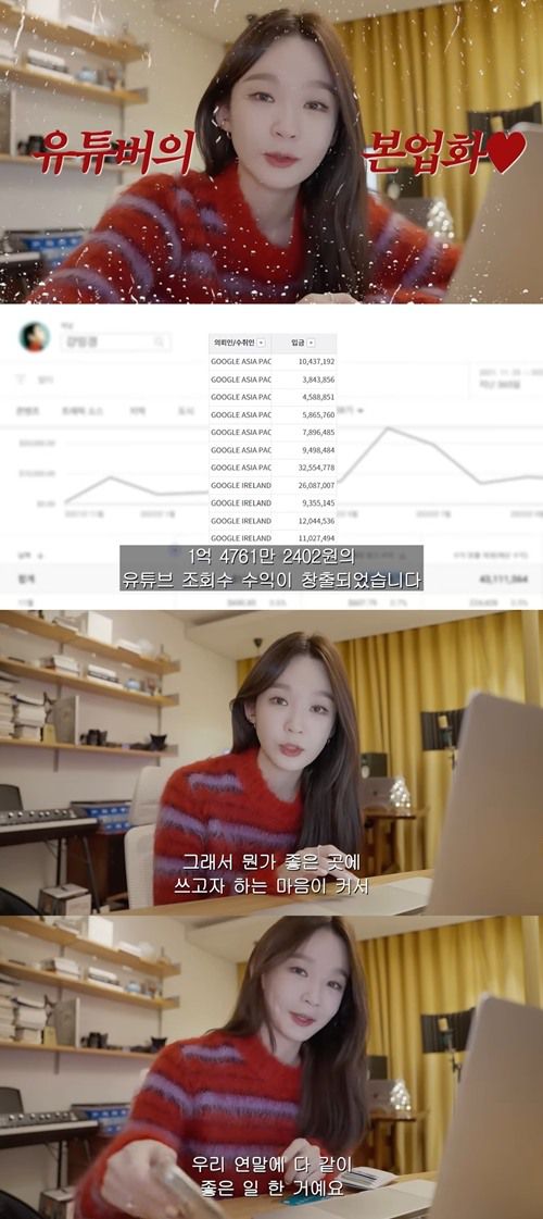 아울러 "여러분들이 봐주셔서 생긴 수익이라 뭔가 좋은 곳에 쓰고자 하는 마음이 커서 연세 세브란스 병원 소아병동에 기부하려고 한다"며 "너무너무 감사하다. 보고 싶고, 늘 기다려지는 콘텐츠 만들 수 있도록 영갈하겠다. 2023년에도 좋은 수익 나오도록 노력하겠다"고 약속했다.