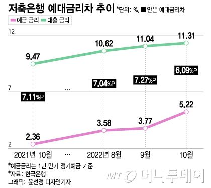 5일 한국은행에 따르면 지난 10월 저축은행의 1년 만기 기준 정기예금(연 5.22%)과 대출 금리(연 11.31%) 차이는 6.09%P(포인트)로 집계됐다. 9월과 비교해 한달 사이 예대금리차가 1.18%P 좁혀졌다.
