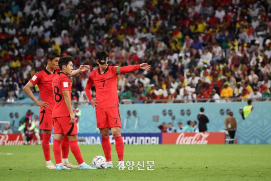 한국 축구국가대표 손흥민과 이강인, 정우영이 28일(현지시간) 카타르 알라이얀 에듀케이션 시티 스타디움에서 열린 2022 카타르 월드컵 조별리그 H조 가나와의 조별예선 경기에서 프리킥을 차기 전 이야기를 하고 있다. 알라이얀|권도현 기자 |