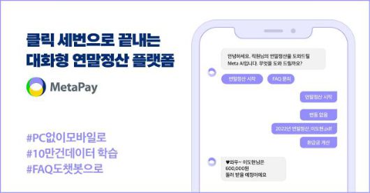 메타페이 연말정산 서비스는 기업 인사담당자 연말정산 업무 부담을 덜어 준다. 일반적인 연말정산 업무는 임직원 연간소득집계와 원천세 신고내역을 교차 검증해 대상자를 선정하고 근로자가 작성한 소득공제신고서를 바탕으로 서류를 검토하는 과정을 거친다. 근로자가 잘못 기재한 데이터와 공제 요건을 수정하는 작업에 많은 시간이 소요된다. 메타페이 연말정산 서비스는 대화형 챗봇이 임직원에게 정확한 공제 요건을 안내하고 세액공제 PDF 자료 내용을 OCR 기술로 인식해 교차 검증과 필수 데이터 입력을 처리해 준다. 또 종이 기반 증빙서류 제출과 관리 업무를 페이퍼리스 환경으로 대체할 수 있다.