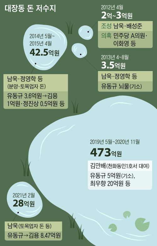 김만배는 2019년 10월부터 이듬해 11월까지 천화동인1호에서 7차례에 걸쳐 473억원을 장기 대여했다. 검찰에서 김만배는 “대부분 다 갚고 130억원 정도 남았다”고 했지만, 검찰이 파악한 돈은 148억원 가량 된다. 검찰은 이 돈의 사용처를 의심하고 있다. 대여와 변제, 투자와 용역계약 등의 여러가지 방식으로 ‘돈 세탁’을 한 흔적이 있기 때문이다. 대장동 일당이 로비를 목적으로 만든 비자금으로 의심받는 ‘돈 저수지’ 중 가장 큰 규모다.