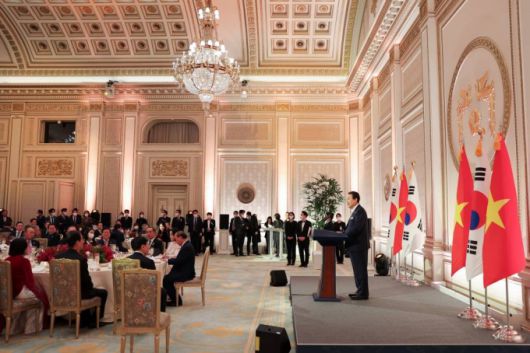 윤석열 대통령이 새 정부 출범 이후 해외 정상으로는 첫 국빈 방한한 응우옌 쑤언 푹 베트남 국가주석 일행과 청와대 영빈관에서 한-베트남 국빈만찬을 열었다.