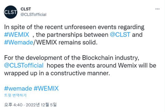 그리고 위믹스 살리기에 동참하는 업체들은 점차 늘어나는 추세다. 최근 위메이드에 지지를 표명한 단기 거래 플랫폼 CLST는 "블록체인 산업 발전을 위해 위믹스를 중심으로 한 이슈가 잘 해결되기 바란다"며 "최근 예상치 못한 사건에도 불구하고 위믹스와의 파트너십은 여전히 견고하다"고 밝혔다.