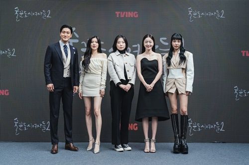 최시원, 이선빈, 박수원 감독, 한선화, 정은지가 ‘술꾼도시여자들2’ 제작발표회에 참석했다. 사진=티빙 |