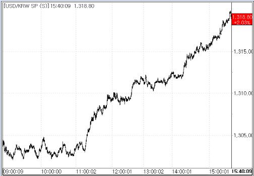 이날 환율은 역외 환율 상승을 따라 전일 대비 11.6원 오른 1304.2원에 시작한 뒤 10원 안팎의 상승폭을 나타내다가 오후로 갈수록 상승폭을 급격히 키우더니 1310원대로 올라섰다. 달러화 강세폭이 커진 가운데, 상단을 제약하고 있던 중국 위안화가 약세 흐름으로 되돌렸고 국내증시도 1~2% 안팎으로 하락하면서 위험회피 심리도 강해졌다.
