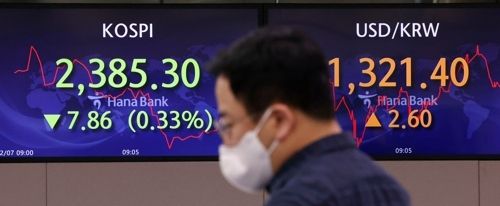 서울 중구 하나은행 딜링룸 전광판에 코스피 지수 등이 표시되고 있다. [사진제공= 연합뉴스] |
