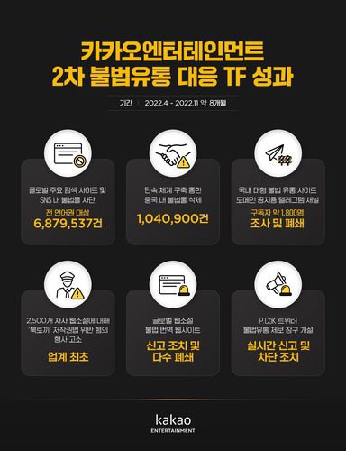 카카오엔터테인먼트는 7일 '2차 글로벌 불법유통 대응백서'를 내고 올해 4월부터 11월까지 글로벌 주요 검색사이트와 소셜미디어(SNS)에서 총 688만건의 불법물을 차단하는 등 불법유통 근절 성과를 냈다고 밝혔다.
