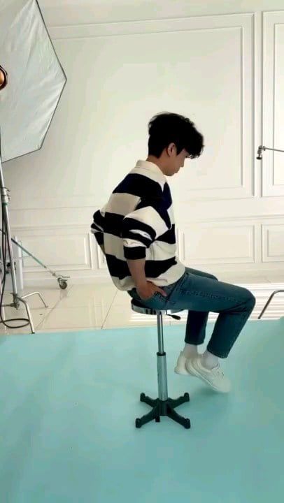 임영웅은 청바지와 운동화를 착용한 상태로 촬영용 의자에 앉아 발재간을 부리고 있다. 장난기가 가득한 그의 모습이 돋보인다.