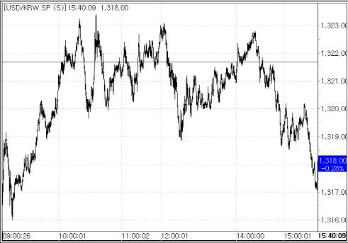 8일 서울외국환중개에 따르면 환율은 전 거래일 종가(1321.7원)대비 3.7원 하락한 1318.0원에 마감했다. 이날 환율은 역외 환율 하락을 따라 5.2원 내린 1316.5원에 시작한 뒤 1310원대 후반~1320원대 초반에서 상승, 하락을 반복하다가 오후들어 낙폭을 다시 키우면서 1310원대로 하락했다. 환율이 1310원대로 마감한 것은 지난 6일(1318.8원) 이후 2거래일 만이다.