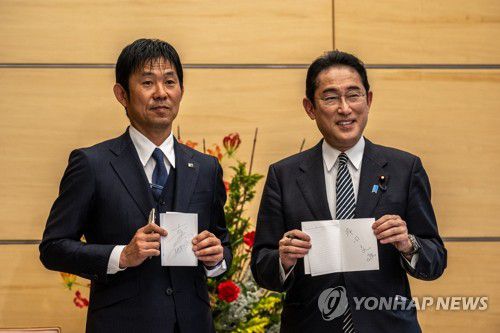 (도쿄=연합뉴스) 박상현 특파원 = 작은 수첩을 들고 다니며 틈틈이 필기하는 '메모광'으로 유명한 기시다 후미오 일본 총리와 모리야스 하지메 일본 축구대표팀 감독이 8일 친필 사인을 한 노트를 교환했다.