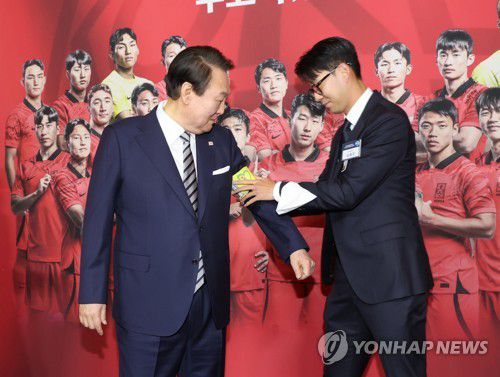 이 자리에서 대표팀 주장 손흥민 선수는 포르투갈전 승리 때 착용한 노란색 주장 완장을 윤 대통령 왼팔에 직접 채워주기도 했다.