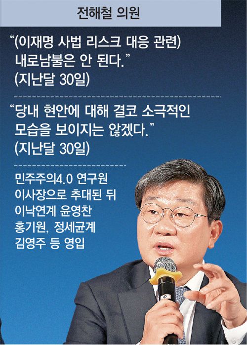 2019년 정계 은퇴를 선언했던 임종석 전 대통령비서실장도 최근 검찰의 서해 공무원 피격 사건 수사를 계기로 지난달 30일부터 일주일 동안 네 차례의 규탄 성명을 내며 재등판했다. 민주당 관계자는 “문재인 정부 전반에 대한 수사가 이어지고 있는 만큼 임 전 실장이 총대 메고 ‘문재인 지킴이’로 나선 것”이라며 “임 전 실장도 이를 발판 삼아 현실 정치 복귀를 꾀하려는 것으로 보인다”고 했다. 친문(친문재인) 의원 싱크탱크인 ‘민주주의4.0 연구원’ 2기 이사장으로 선출된 전해철 의원도 최근 민주주의4.0에 친이낙연, 친정세균계 의원들을 새로 영입하는 등 외연을 확장하고 있다.