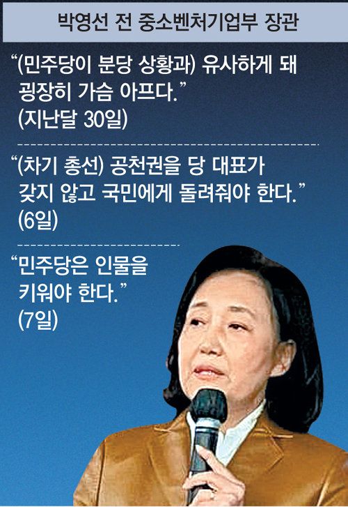 지난해 4·7 서울시장 보궐선거 패배 이후 잠행을 이어오던 박영선 전 중소벤처기업부 장관은 최근 “새로운 민주당을 보여줘야 한다”며 연일 이 대표를 직격하고 있다. 지난달 30일 처음으로 분당(分黨) 가능성을 언급한 데에 이어 이 대표에게 “차기 총선 공천권을 내려 놓으라”(6일), “‘개딸’ 등 팬덤 정치에서 멀어지는 정당으로 바뀌어야 한다”(7일)고 요구하고 있다. 야권 관계자는 “박 전 장관이 다음 달 미국 출국을 앞두고 정치적 존재감을 확실히 못 박으려는 것”이라며 “서울시장 선거 패배 이후 향후 정치적 역할을 고민하던 상황에서 정당 혁신 및 분당, 공천권 등 다양한 화두를 던지고 반응을 살피는 것으로 보인다”고 했다.